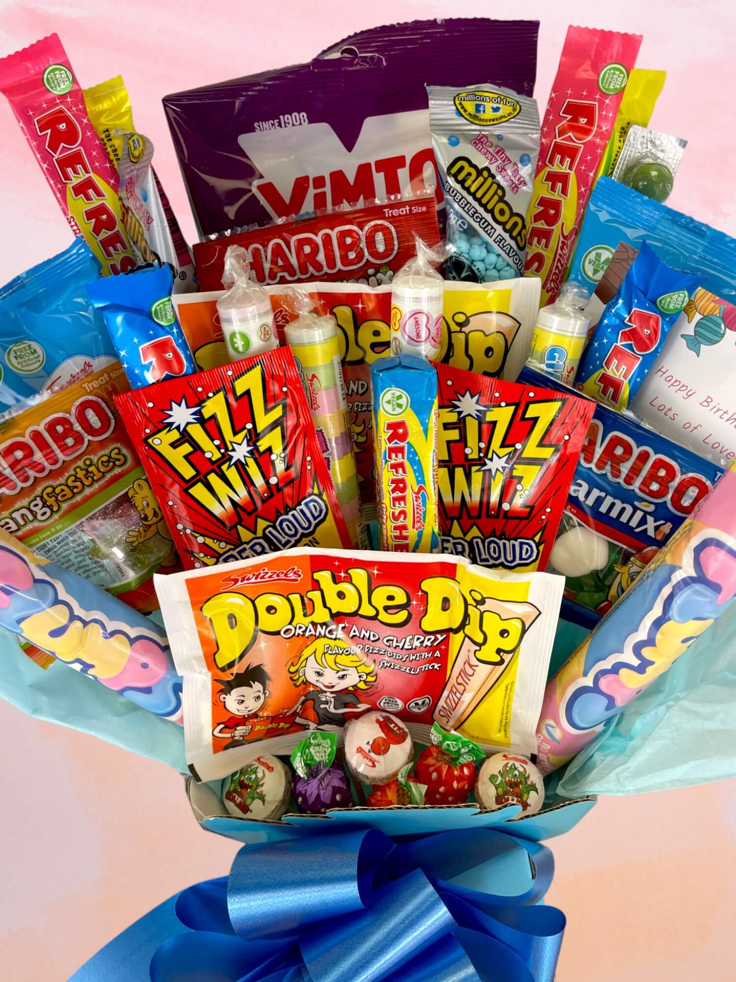 But what about the sweets themselves? Well, we wouldn't want to spoil the surprise, but we can tell you that this bouquet is packed with all your favorite classic British sweets. From Fizz Wizz Popping Candy to Stinger Bars, Refresher Packs, and Giant Love Hearts, there's something for everyone in this sweet selection.